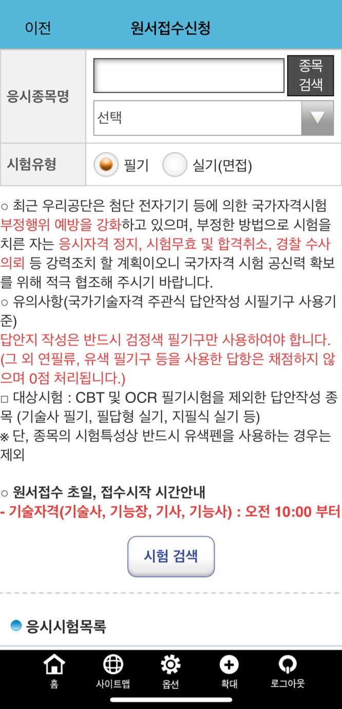 그럼 본인이 응시할 종목을 선택하고 시험 검색을 클릭하면 응시 시험 목록에 본인이 선택한 시험이 뜬다.